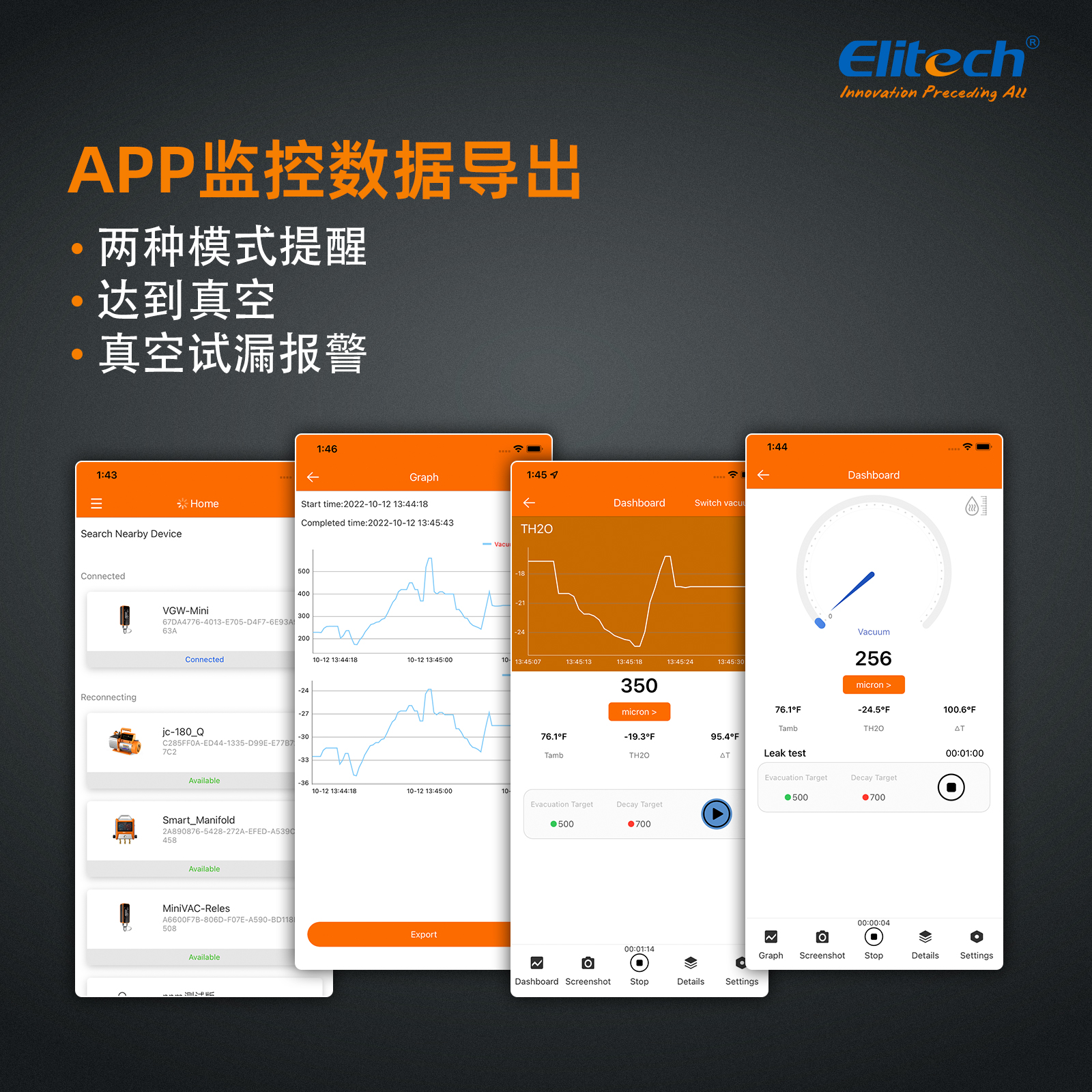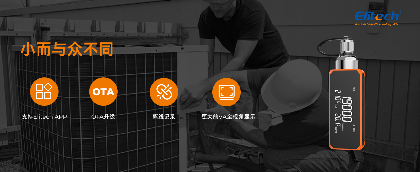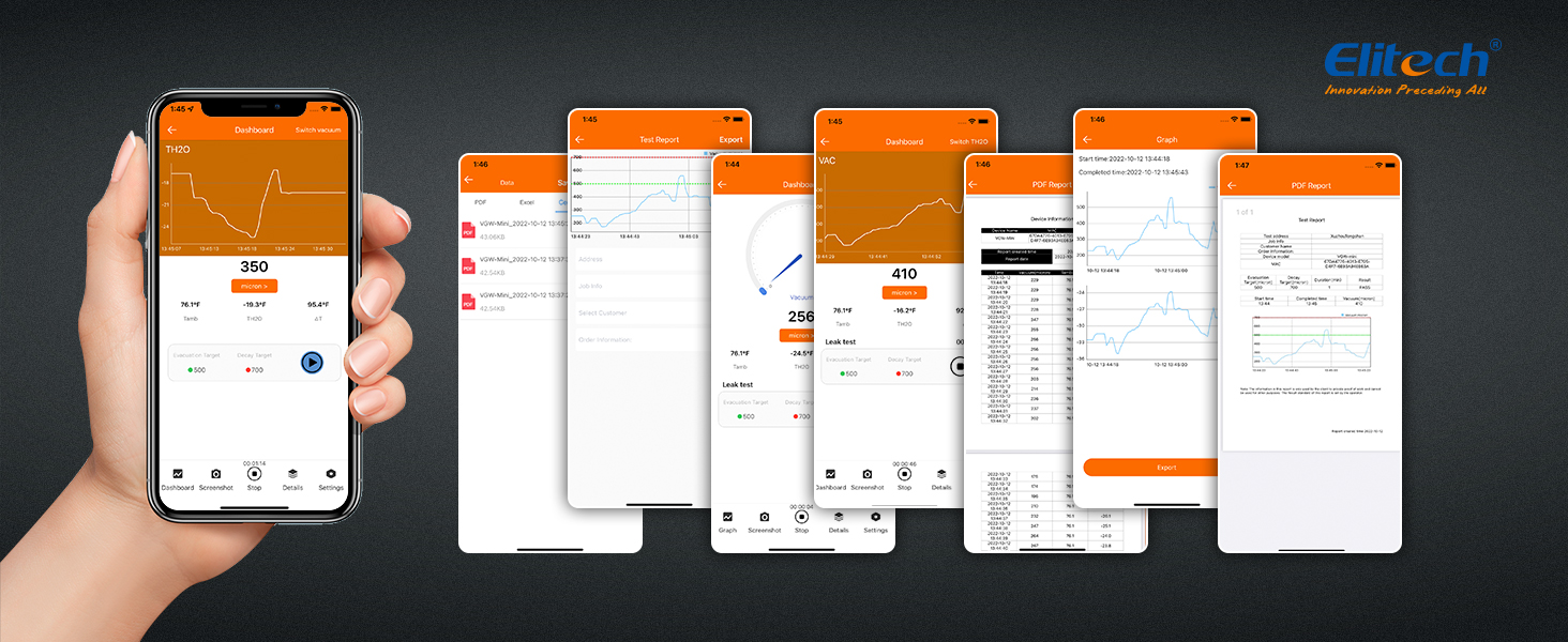 - 智能 APP 控制:“Elitech Tools”APP 遠(yuǎn)程控制您的真空計(jì),快速方便地記錄您的工作,完成您的報(bào)告并導(dǎo)出。