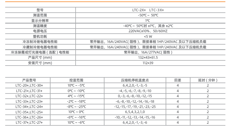 ● 1 路溫度傳感器用于柜溫調節; ● 1 路控制輸出可進行制冷控制; ● LTC-3X+ 系列具有定時停機除霜功能,LTC-2X+ 系列無停機除霜功能; ● 旋鈕式波段開關進行溫度設置,共有7 個溫度控制檔及OFF 關機檔; ● LTC-2X+ 為快接端子接線方式,方便專業設備制造商的生產和售后。