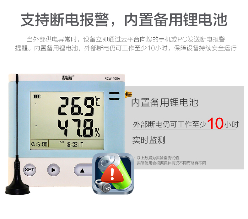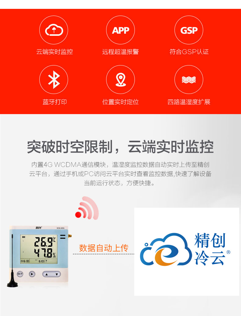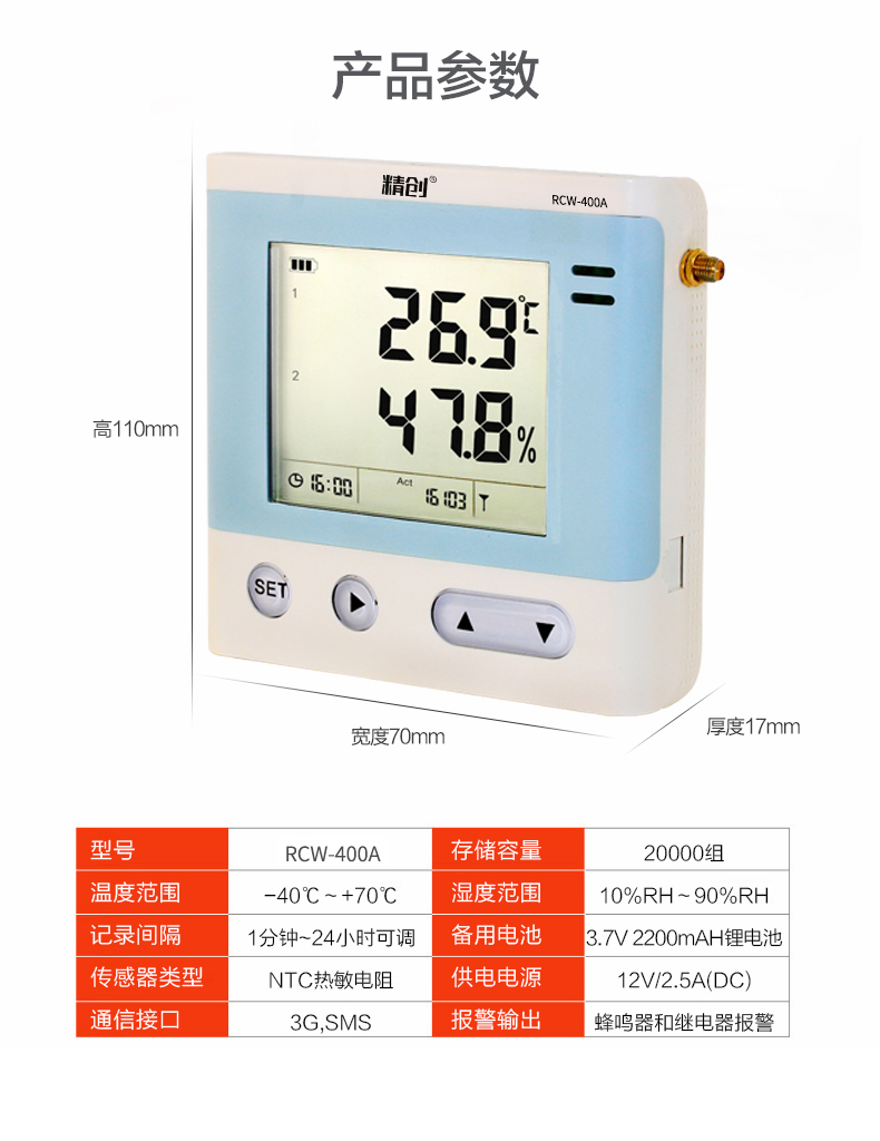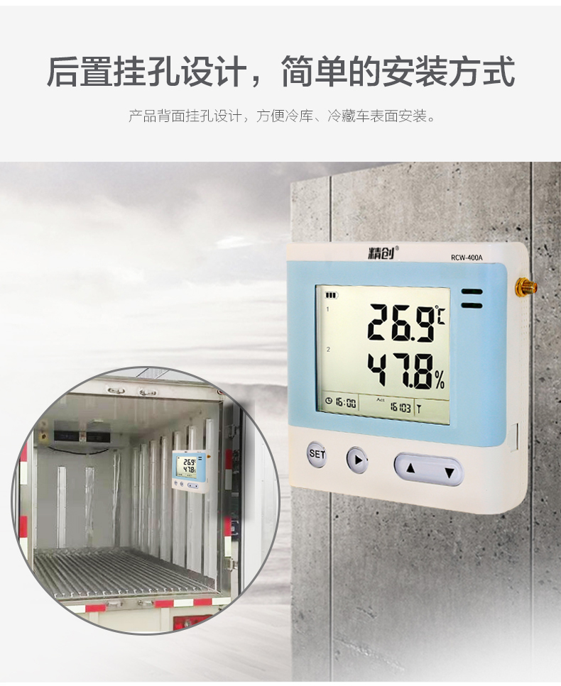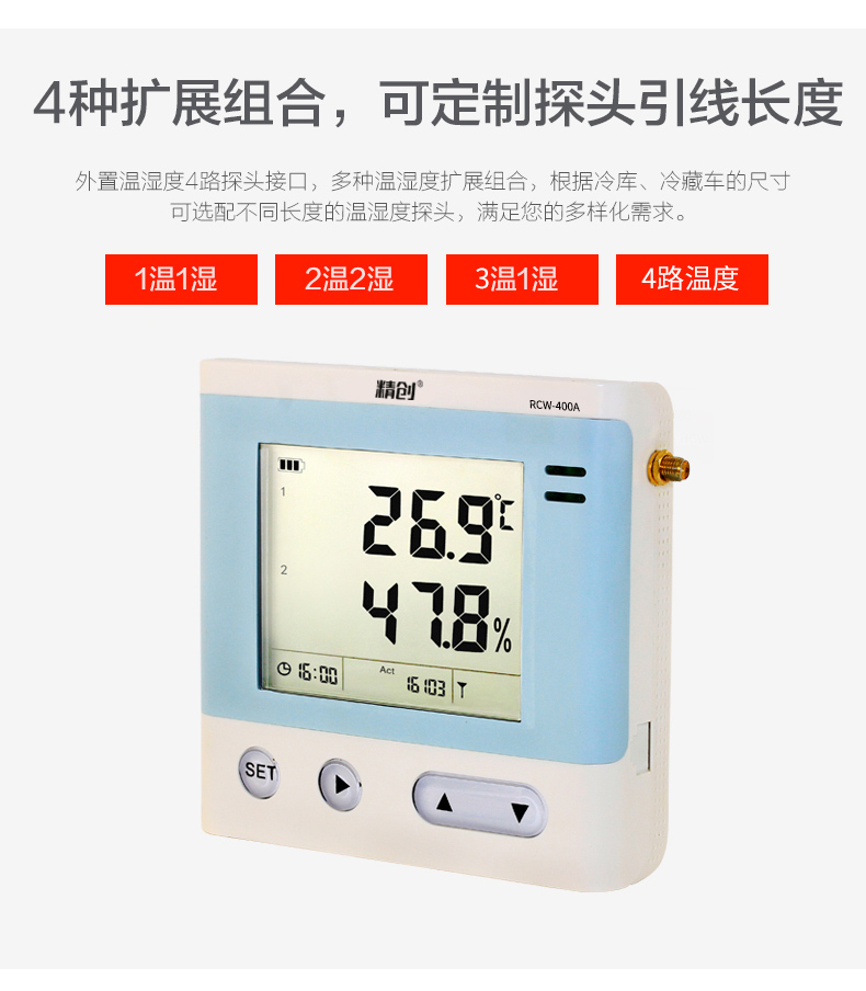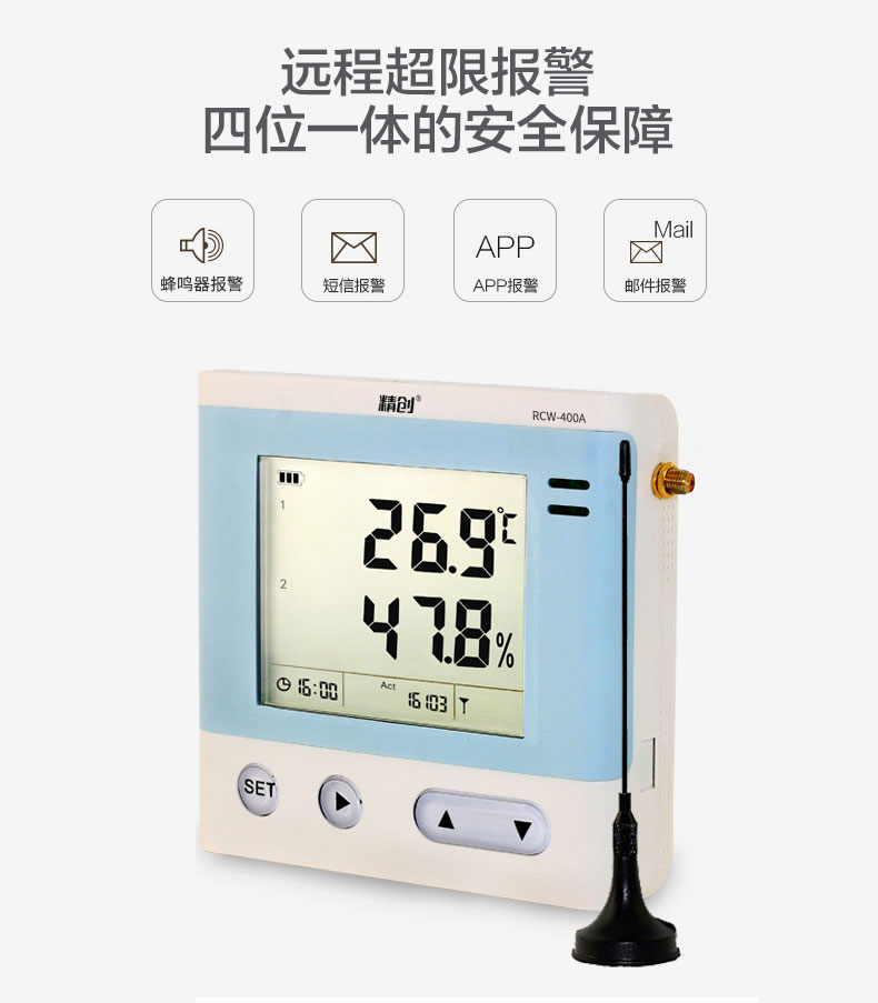 RCW-400A 是一款 4 路溫濕度記錄儀,具有測溫范圍寬、精度高等優(yōu)點。段式液晶屏可同時顯示系統(tǒng)時 鐘、當(dāng)前工作狀態(tài)、記錄容量以及記錄數(shù)據(jù)。內(nèi)置蜂鳴器以及外接聲光報警器,具備無線 3G 或4G 網(wǎng)絡(luò)數(shù)據(jù)傳輸方式, 結(jié)合冷鏈物聯(lián)網(wǎng)平臺,在可上網(wǎng)終端上隨時查看溫濕度數(shù)據(jù)。