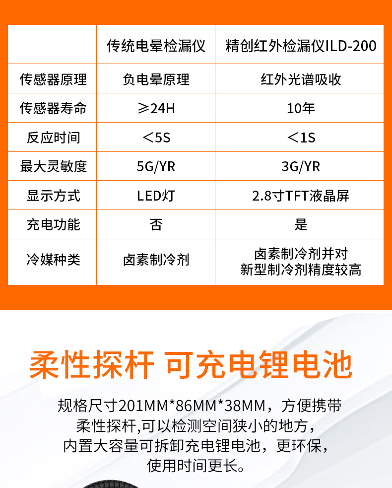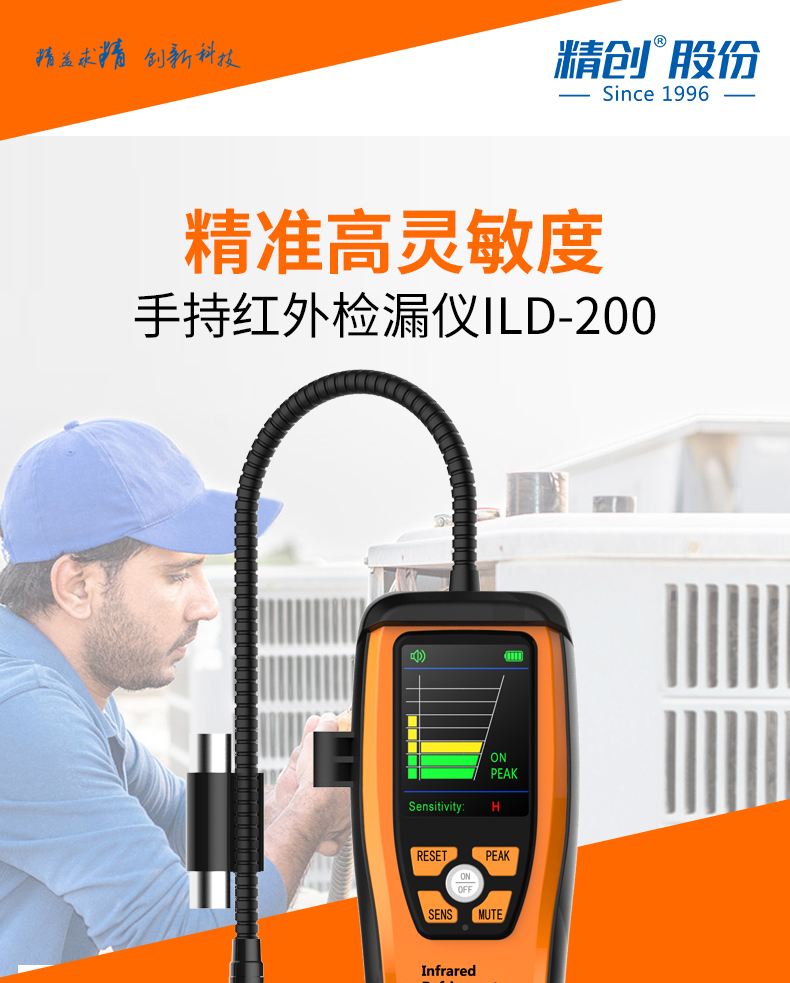 ILD-200是一款手持制冷劑檢漏儀,利用紅外傳感器的低成本方案有效的查找CFC(氯氟烴),HFC(氟代烷經),HCFC(氫氯氟烴)與HFO(氫氟烯烴)制冷劑。預熱時間僅需30秒,充電一次可使用8小時,是真正的首選檢漏工具。